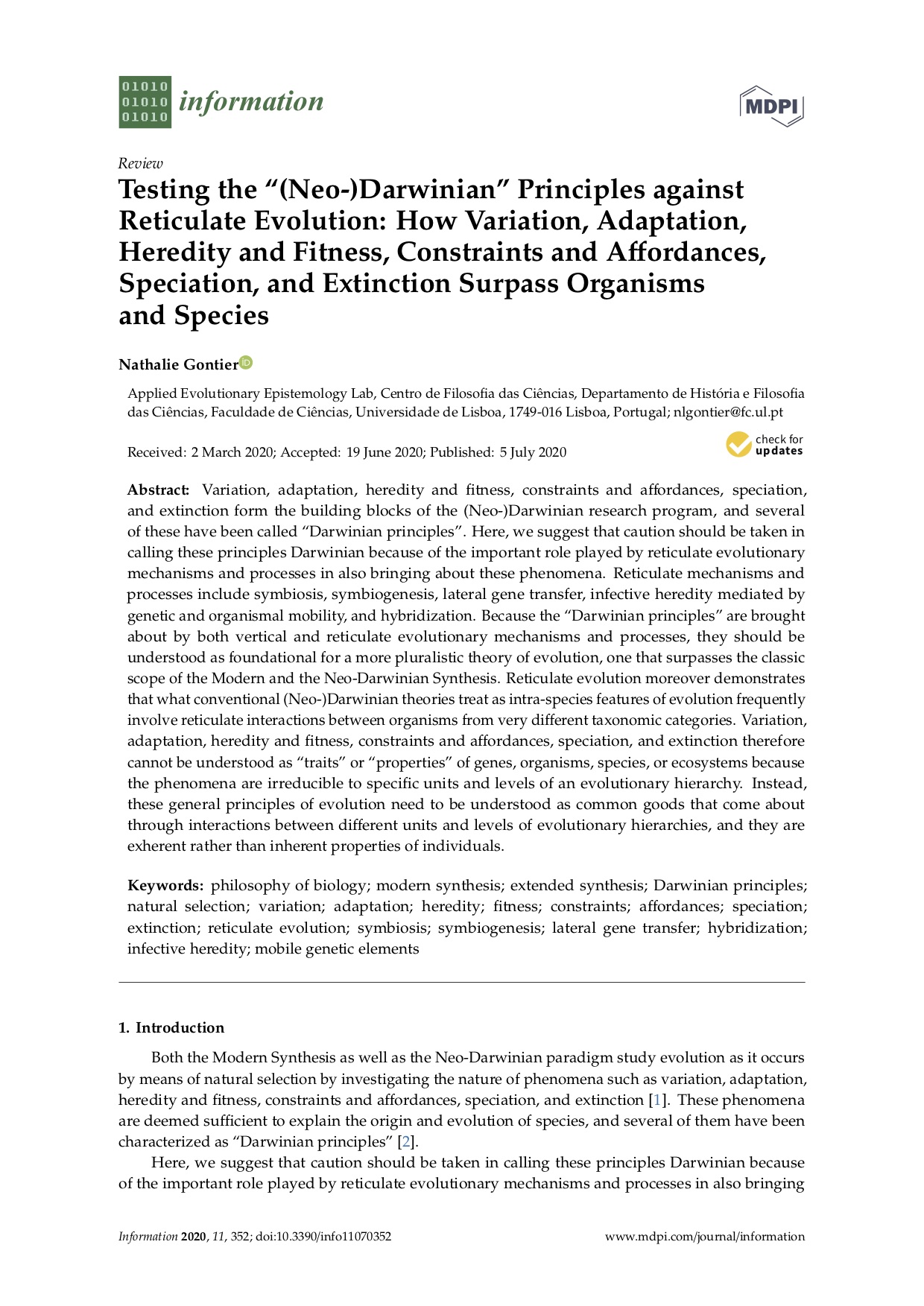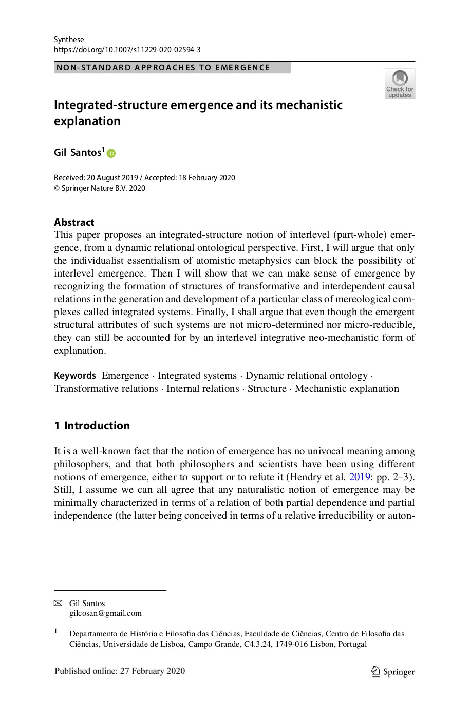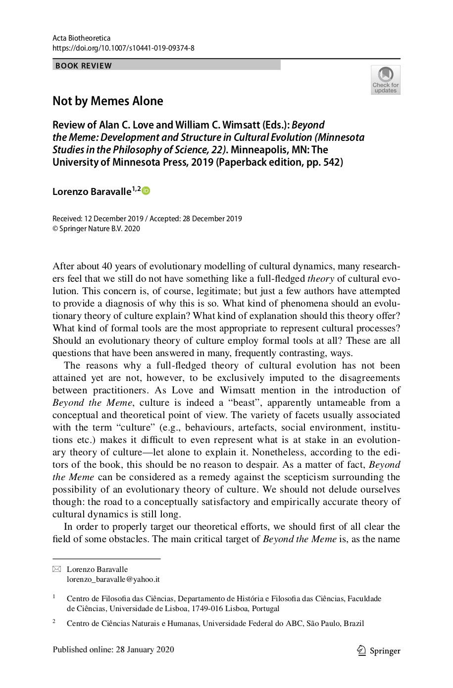 Springer, Acta Biotheoretica, 28 Janeiro 2020